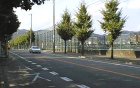 安倉上ノ池付近 この付近の道路は、それいけ!ズッコケ三人組の中では、 下校シーン、人との待ち合わせシーン、バス待ちのシーン (ドラマで登場するバス停は正式な物ではなく、 この写真の場所から北へ100メートルのところに特別に立てられていたもの…) などで使用されていました。右手に見える高いフェンスは上ノ池の水上ゴルフ場のゴルフボール防護柵です。 阪急逆瀬川駅、阪急中山駅からバス「宝塚営業所前」下車 |