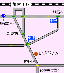| アクセス | @加古川駅から神姫バス北在家車庫行で終点下車、徒歩2分。A国道2号線明石方面からは平野交差点で左折し、3つ目の「粟津交差点」を左折南進し約100m。B明姫幹線からは鶴林寺西交差点を加古川駅方面へ北進約800m |