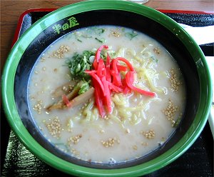 メニューは、あっさり東京風の醤油ラーメン、塩ラーメン、味噌ラーメン、 こってりした豚骨醤油ラーメン、豚骨塩ラーメン、豚骨味噌ラーメン、 ピリ辛の韓国ラーメンなどメニューは多数あり、今回は豚骨醤油を注文。 明石で感じたみたいな業務用っぽい味は感じず、そこそこのラインは保っているらしい。 ただ、メニューには「濃厚だ」「こってりだ」とか書かれていても、 我々の思うコッテリと関西での一般的なコッテリでは表現に差がありすぎるのでやっぱり味は薄いんだけど。