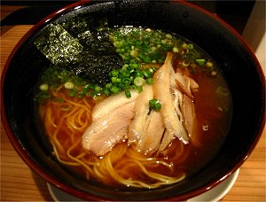 ツルツルとした中細ストレート麺にスープは丼から香ってくるカツオの匂いから見て、 カツオの他にイリコから取ったと思われる和風で、ちょっと甘さも感じるあっさり醤油味。 黒いどんぶりだったので画像ではわかりづらいけど、チャーシューのほかに海苔もトッピングされとります。