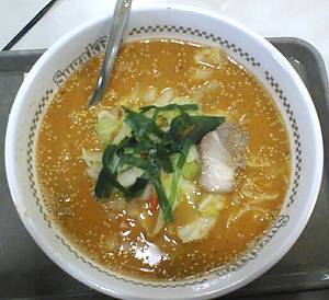 すがきやは別名「中高生のお供」と言われるくらい(特に女子に?)中学生、高校生の客が多い…。 それもそのはずで値段が安い! ちなみに左の写真は「担々麺」なのですが値段は忘れた〜(^_^;)・たしか500円玉を出してお釣りがありました。