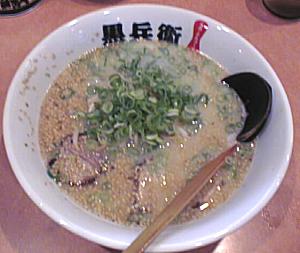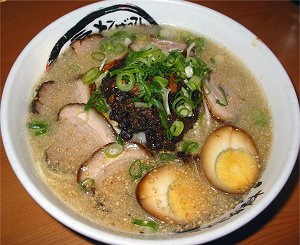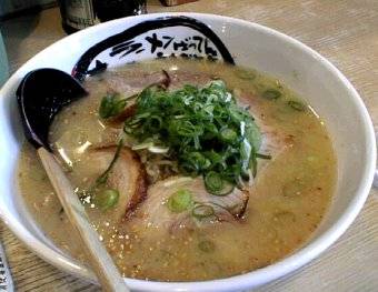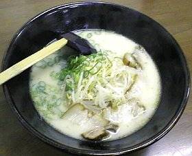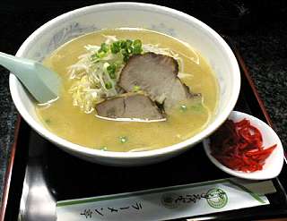 ラーメンは太めのちぢれ麺に、真っ白い白濁とんこつスープ。