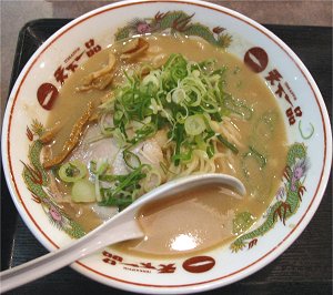 わりと浅い目の丼鉢に入ったトンコツベースのラーメンが出てきた。スープを一口…、すごくあっさり。