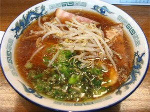 麺を茹で、スープを丼に注ぎ茹でた麺を手際よく入れる。そしてチャーシューとネギ、麺茹でと同じ釜で茹でたモヤシを入れてできあがり。